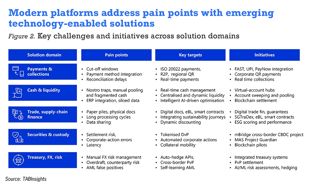 Vietnam’s Techcombank exemplifies this transformation. Through ERP-integrated treasury solutions and VA platform it has embedded payments, liquidity tools and reconciliation within client workflows. It automated receivables reconciliation, reduced manual processes, and improved reporting accuracy, resulting in its VA platform witnessing an eleven-fold increase in volumes and four-fold rise in value over 2024. Its C-Cash Treasury platform delivers real-time forecasting; more than 45 machine learning (ML) models enhance fraud detection and personalisation. As a result, in 2024, 91% of transactions are conducted digitally, with a 50% rise in e-banking volumes.